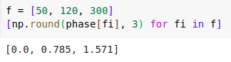 As expected, the time domain signal is a complex waveform and the magnitude plot shows peaks at the three frequencies which constitute the waveform. For the phase plot, if we read out the phase values at the relevant frequencies, we get the expected phase values (for the non-existent frequencies, the phase values are random1).